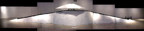 冷房のあまり効いていないだだっ広い会場。中央に張りぼての雪山が置かれている。その稜線に沿って、レールのようなものが敷かれ、その上をやはり張りぼての小さめの雪山が動いている。裾野から頂上へ、頂上から裾野へ、ゆっくりと、ひたすらそれを繰り返す。ただそれだけの作品。現代美術に意味を求める観客ならば腹を立てかねない作品だ。この蒸し暑い中、何でこんなものをじっと眺めていなければならないのか。でもわたし的には気に入った、このバカバカしさが。